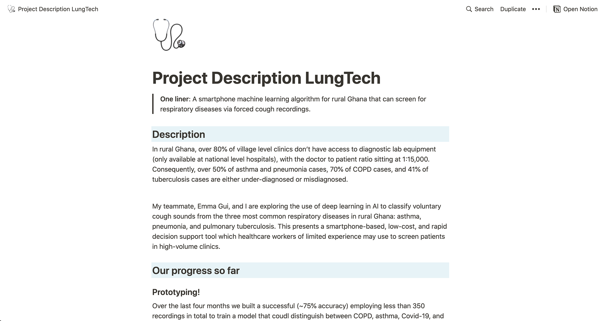 My teammate, Emma Gui, and I are exploring the use of deep learning in AI to classify voluntary cough sounds from the three most common respiratory diseases in rural Ghana: asthma, pneumonia, and pulmonary tuberculosis. This presents a smartphone-based, low-cost, and rapid decision support tool which healthcare workers of limited experience may use to screen patients in high-volume clinics.